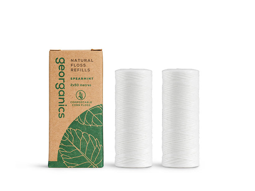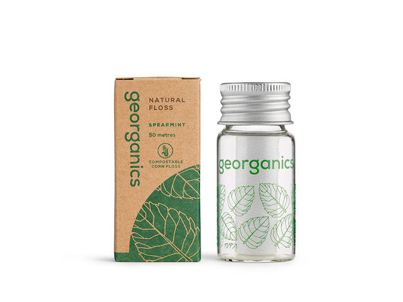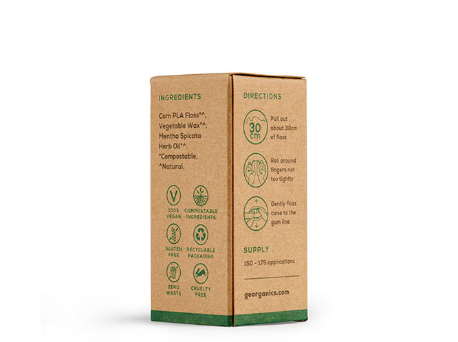 Fio dentário natural de PLA de amido de milho, revestido a cera vegetal de candelila e óleo essencial de hortelã. Armazenado numa embalagem de vidro, sem plástico, com dispensador de aço inoxidável e tampa de alumínio, que permite cortar o fio de maneira simples e prática e proteger a ponta caso vá de viagem.