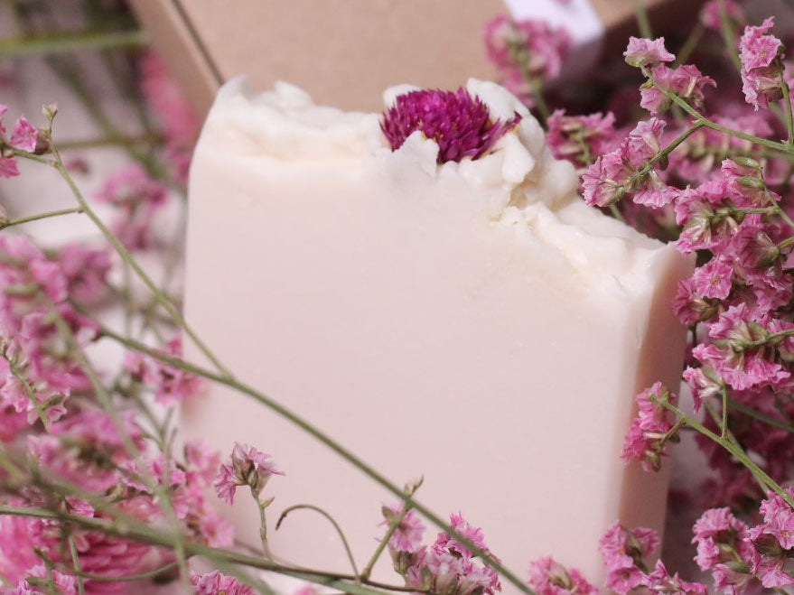 IngredientesCocos Nucifera Oil, Aqua, Sodium Hidroxide, Perfume, Titanium Dioxide e pétalas de flores de perpétua roxa.